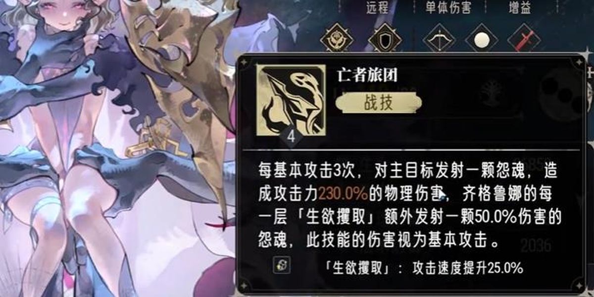 3、亡者旅團(tuán)是重要戰(zhàn)技,通過基礎(chǔ)攻擊積累次數(shù)后向敵人發(fā)射怨魂造成額外傷害,生欲搜取層數(shù)越多怨魂發(fā)射次數(shù)越多,讓齊格魯娜在群體戰(zhàn)斗中也能發(fā)揮重要作用。
