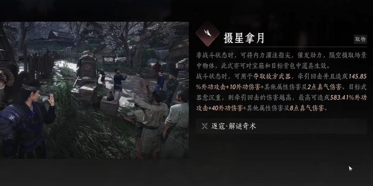 2、接取任務(wù)后要找到奇術(shù)大師仇越海,他會(huì)講解攝星拿月技能的使用方法,對(duì)話結(jié)束后玩家將獲得關(guān)鍵道具卸功丹,為后續(xù)任務(wù)環(huán)節(jié)做好物品準(zhǔn)備。