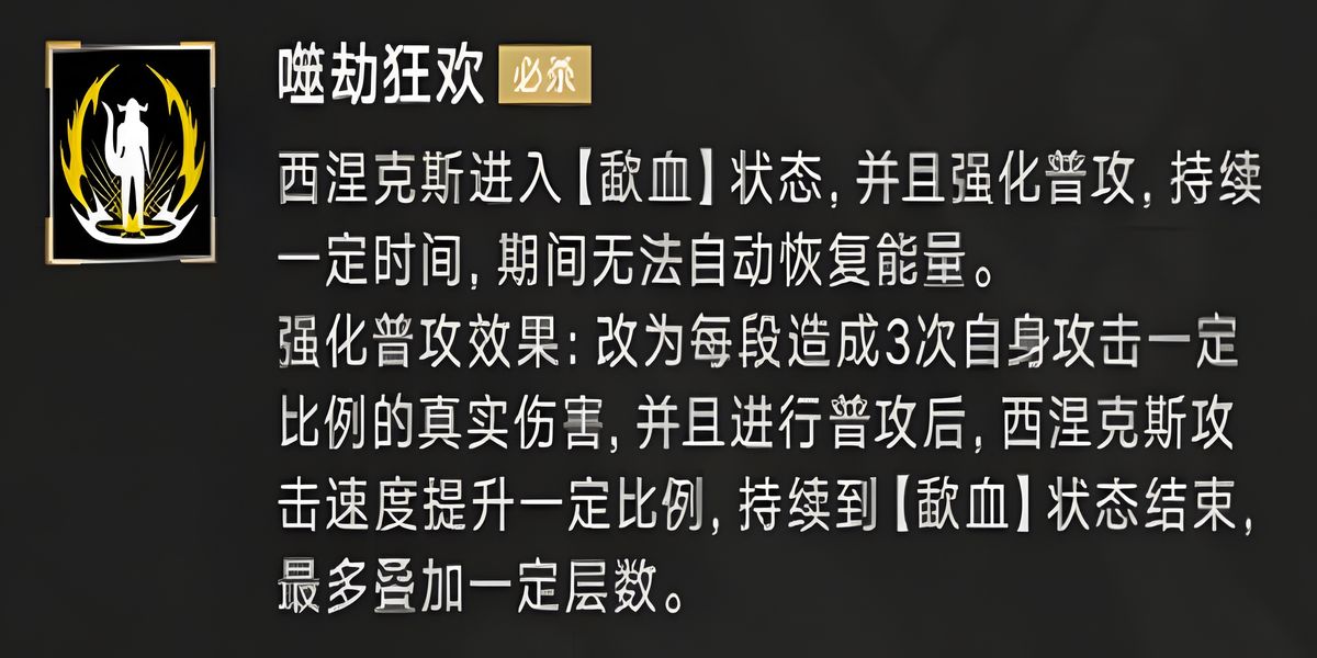 2、必殺技噬劫狂歡開啟后進(jìn)入歃血狀態(tài),攻擊速度和傷害提升,每次普攻造成三倍真實(shí)傷害,攻擊速度隨時(shí)間持續(xù)增長(zhǎng),形成越戰(zhàn)越勇的戰(zhàn)斗節(jié)奏。