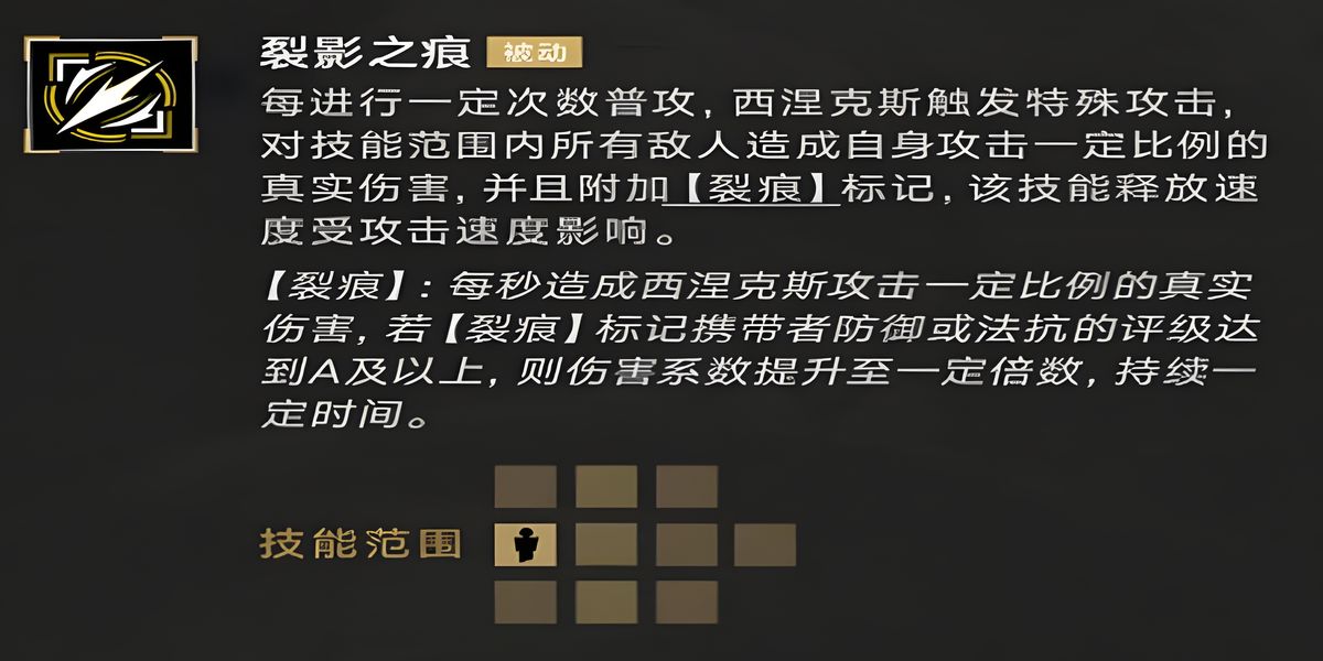 3、被動(dòng)技能裂影之痕讓每次攻擊觸發(fā)范圍傷害,為敵人附加裂痕標(biāo)記,造成持續(xù)真實(shí)傷害,傷害量隨敵人防御力提升而增加,完美克制高防御目標(biāo)。