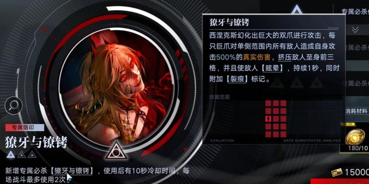 4、專屬技能獠牙與鐐銬讓其幻化出巨大的雙爪形態(tài)攻擊,擁有強(qiáng)力范圍攻擊和控制效果,還能附加裂痕標(biāo)記,集傷害控制標(biāo)記于一體,是扭轉(zhuǎn)戰(zhàn)局的關(guān)鍵技能。