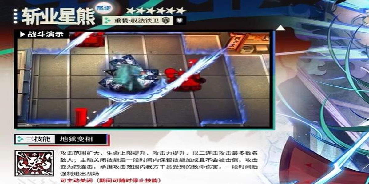 5、三技能地獄變相擴(kuò)大攻擊范圍,提升生命上限和攻擊力,以二連擊攻多名敵人,關(guān)技能后保留加成不被擊倒,攻變四連擊,承擔(dān)范圍內(nèi)致命傷害,后強(qiáng)制退場(chǎng)護(hù)隊(duì)友。