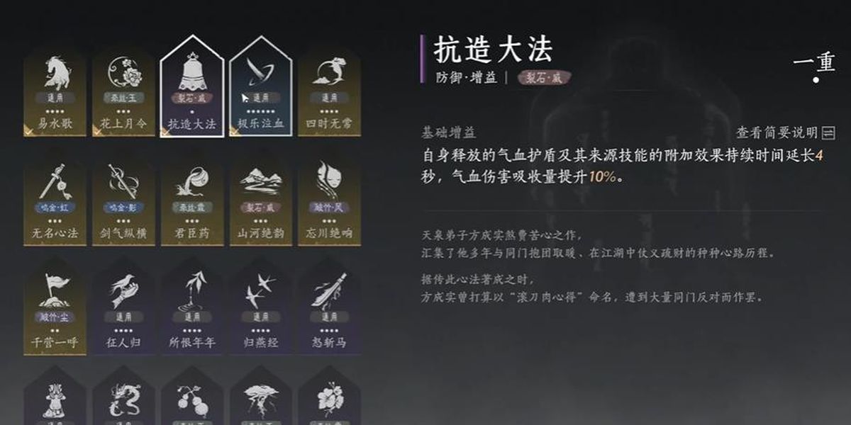 1、武學(xué)選擇嗟夫刀法與青山執(zhí)筆,心法必須攜帶抗造大法,這是該打法的基礎(chǔ)配置,能為后續(xù)操作提供必要的技能支持與生存保障,確保打法順利實施。