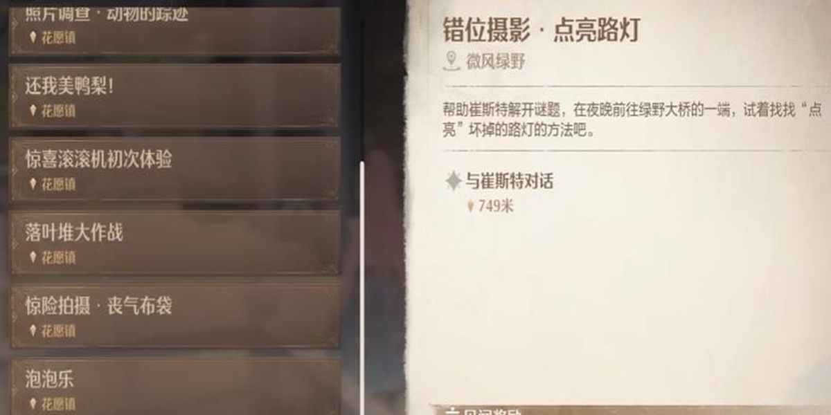 4、提交照片,拍照完成后將照片提交給崔斯特,任務(wù)即可完成,通過這一系列操作能順利達(dá)成錯位拍照點亮路燈的目標(biāo)。