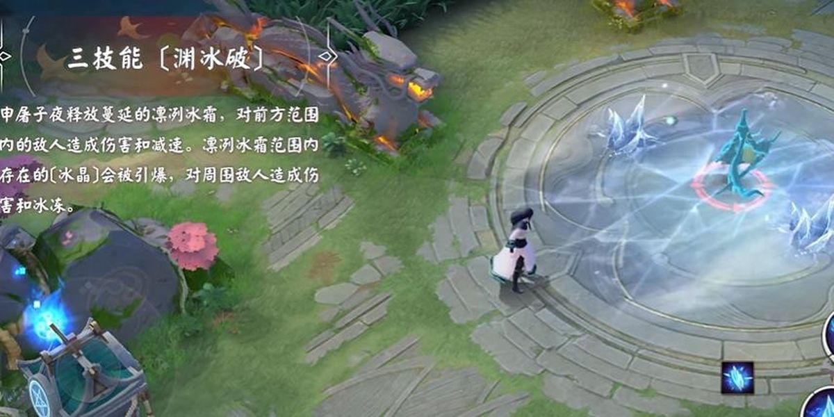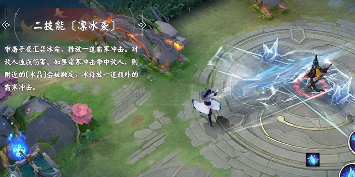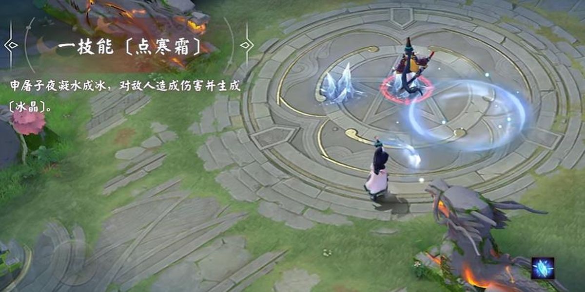 2、一技能點寒霜凝水成冰,短暫延遲后對圓形范圍內(nèi)敵人造成傷害,同時在中心生成冰晶,該技能可用于范圍傷害與制造冰晶,為后續(xù)控制和輸出做準(zhǔn)備。