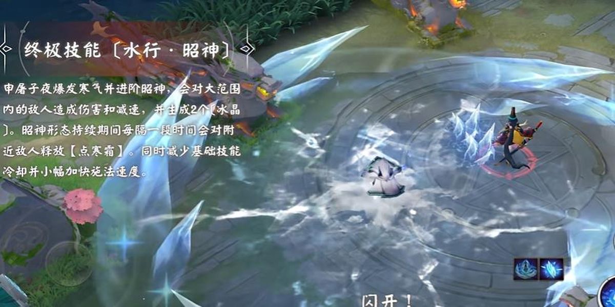 5、終極技能水行昭神爆發(fā)寒氣進(jìn)階昭神,對大范圍內(nèi)敵人造成傷害和減速,生成2個冰晶,昭神形態(tài)持續(xù)期間會自動釋放點寒霜,還能減少基礎(chǔ)技能冷卻并加快施法速度。