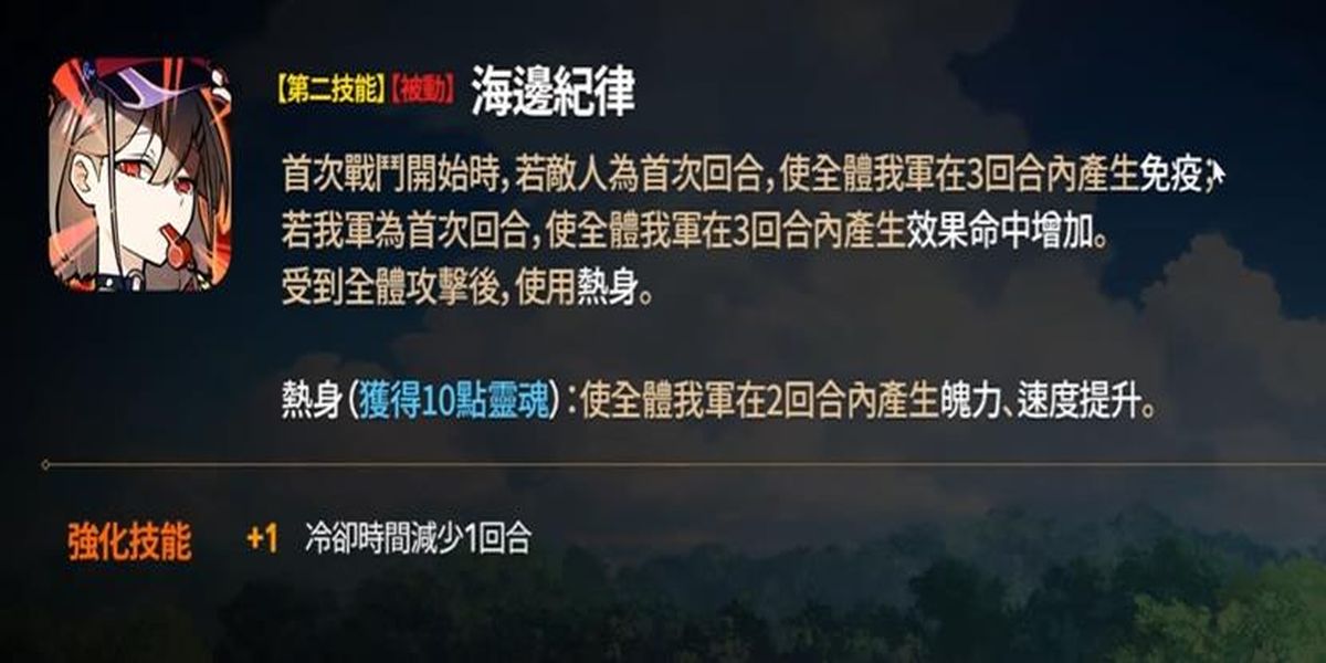 1、被動(dòng)海邊紀(jì)律首戰(zhàn)開始,敵先手我軍全體3回合免疫,我先手隊(duì)友3回合效果命中提升,自身遭全體攻擊后獲10點(diǎn)靈魂,讓成員2回合獲魄力和速度提升,強(qiáng)化后冷卻減一回合。