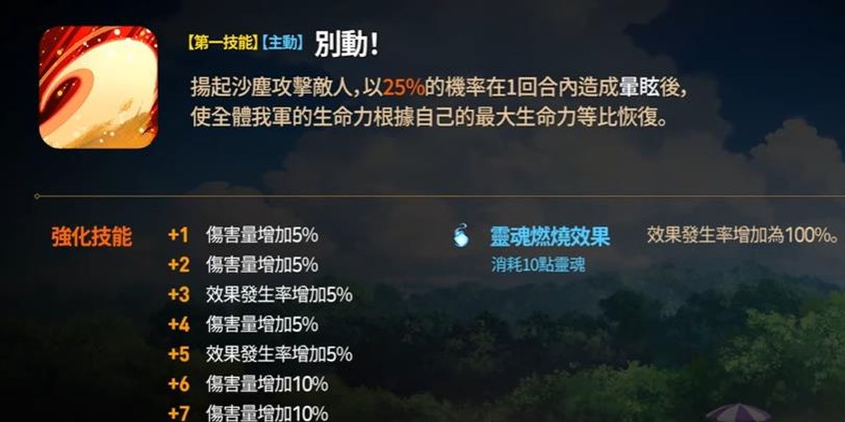 2、主動(dòng)技別動(dòng)揚(yáng)起海沙攻敵,25%概率1回合眩暈,依自身最大生命值讓我軍全體等比回血,耗10點(diǎn)靈魂效果發(fā)生率100%,強(qiáng)化后速攻值升,強(qiáng)化到4冷卻減一回合。