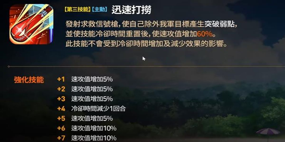 3、迅速打撈讓隊(duì)友獲突破弱點(diǎn),技能冷卻重置后升60%速攻值,神器女王之哨1級(jí)隊(duì)友攻升5%,攻最高者回合結(jié)束速攻升10%,2回合一次,滿級(jí)攻升10%速攻升20%。