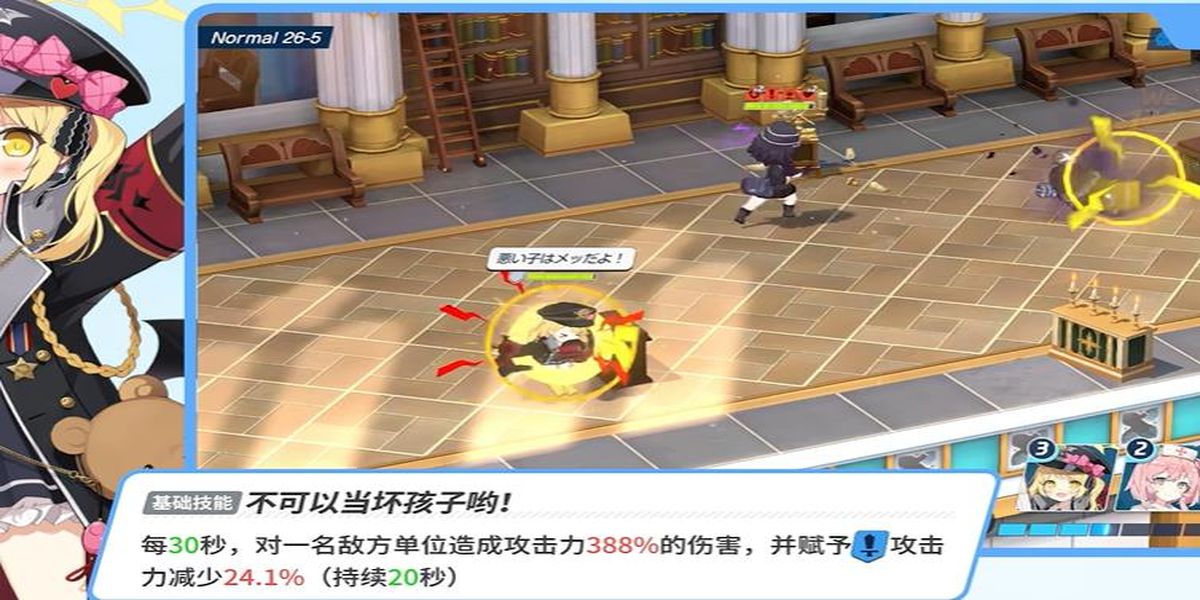2、基礎(chǔ)技不可以當(dāng)壞孩子喲按間隔觸發(fā),依自身攻擊力對(duì)1名敵人造成傷害并降低其攻擊力,效果可疊加,針對(duì)敵方關(guān)鍵輸出使用,能削減敵方輸出,創(chuàng)造己方輸出環(huán)境,提升勝率。