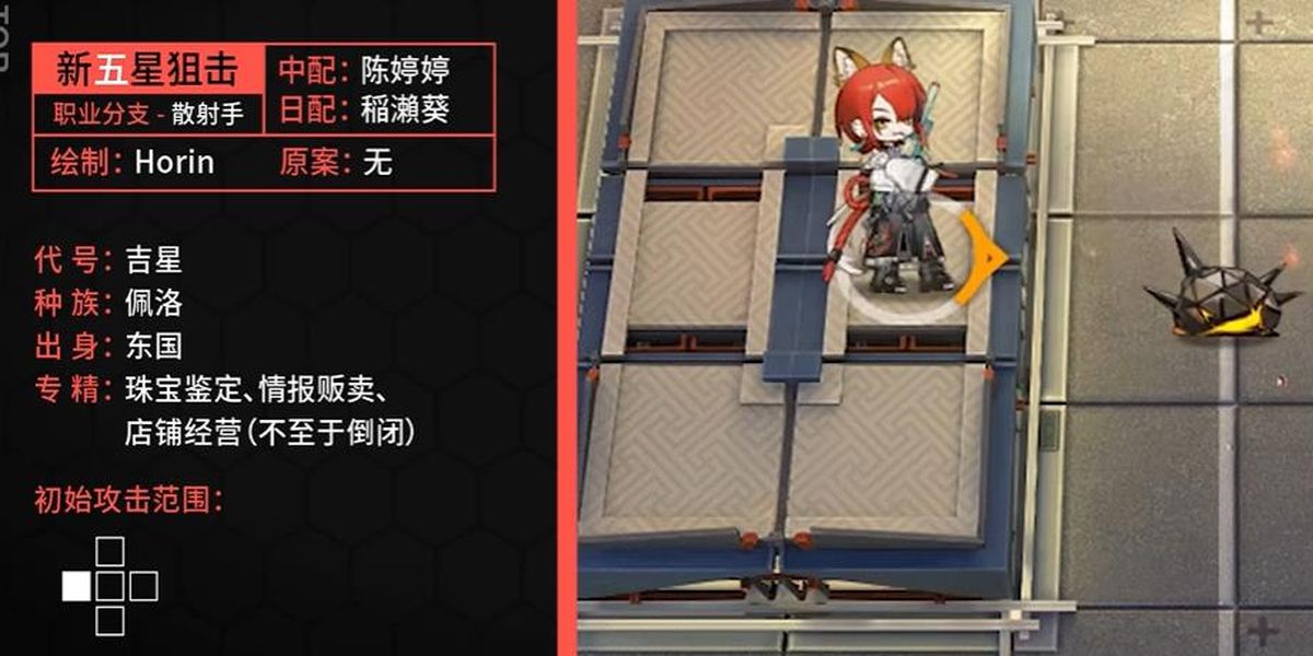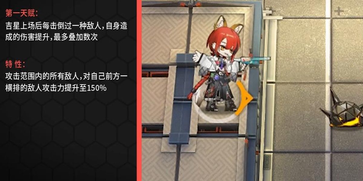 1、吉星攻擊范圍為前方四格,特性使攻擊范圍內所有敵人中,前方一橫排敵方單位受其150%攻擊力傷害,置于合適位置能大幅提升對一排目標的輸出。