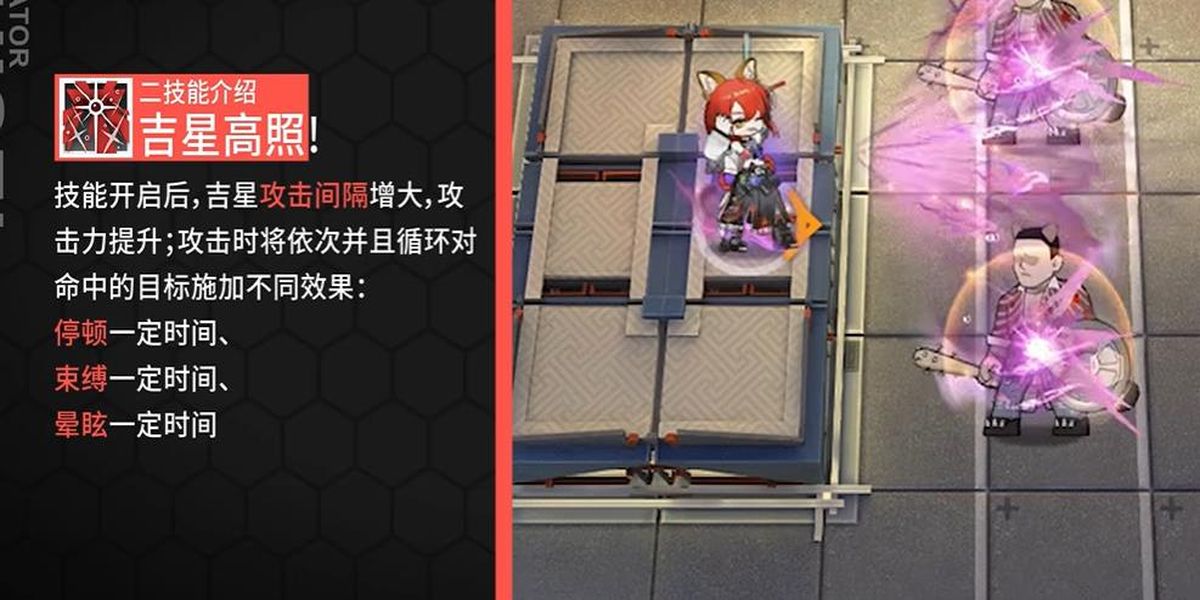 4、二技能吉星高照釋放后,攻擊間隔增大且攻擊力增強,攻擊時依次循環(huán)對命中目標施加停頓、束縛或眩暈效果,能有效限制敵方行動。
