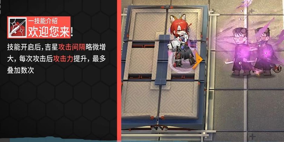3、一技能歡迎您來開啟后,攻擊間隔略微增大,每次攻擊后攻擊力提升,最多疊加數(shù)次,與天賦配合能最大限度提升輸出,對敵方造成強力傷害。