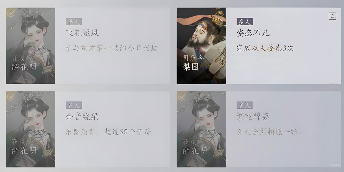 2、完成3次門派號(hào)令漲90進(jìn)度值,推薦做三個(gè)任務(wù),F(xiàn)2看報(bào)和古琴完成飛花逐風(fēng)和余音繞梁,多人合影去多人世界拍一張即可輕松達(dá)成。