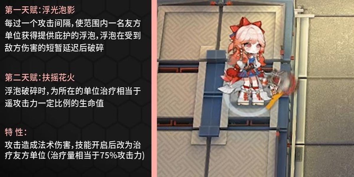 1、特性為攻擊造成法術傷害,技能開啟后改為治療隊友,治療量攻擊的75%,浮光泡影每過一個攻擊間隔,讓范圍內(nèi)一位隊友獲得浮泡,浮泡提供庇佑效果,受敵傷害后破碎。