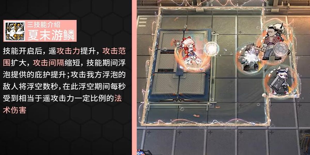 4、夏末游鱗使攻擊提升、范圍擴大且攻擊間隔變短,持續(xù)期間浮泡庇護提升,敵人攻擊帶浮泡目標會浮空數(shù)秒,為我方創(chuàng)造進攻機會,浮空期間敵人每秒受一定法術傷害。