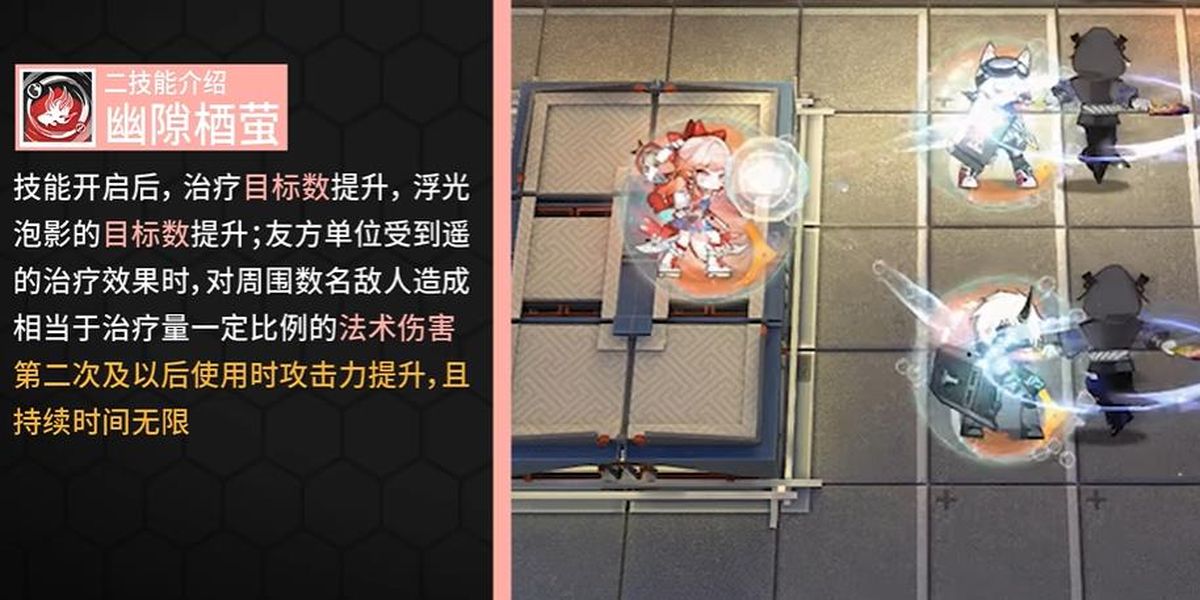 3、幽隙棲螢提升每次治療的目標數(shù),天賦提升浮泡目標數(shù),隊友受自身治療時,對周圍多名敵人造成一定治療量的法術傷害,第二次及以后使用時攻擊力提升且持續(xù)時間無限。