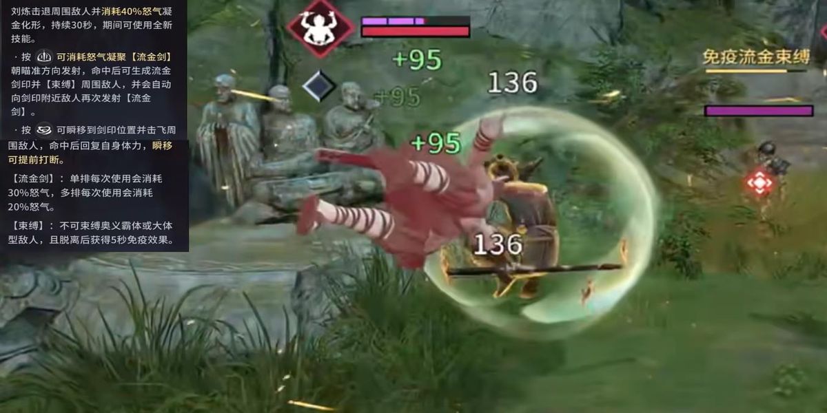 3、奧義技能金石鑠消耗40%怒氣釋放,是核心技能,30秒內(nèi)可發(fā)動流金劍遠(yuǎn)程攻擊,命中后在敵人周圍生成劍印,對范圍內(nèi)目標(biāo)造成束縛并為自己回復(fù)生命值,提供遠(yuǎn)程壓制手段。