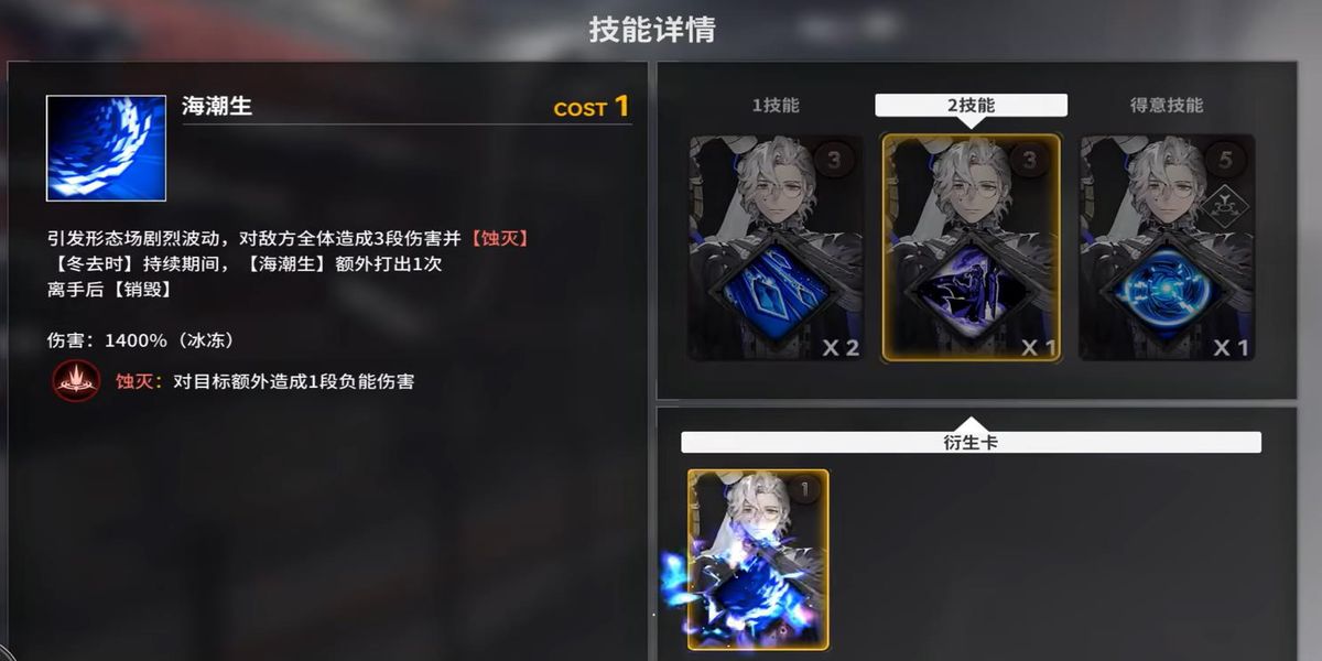4、三技能潮海生引發(fā)形態(tài)場(chǎng)劇烈波動(dòng),對(duì)敵方全體造成3段傷害并附加蝕滅,冬去時(shí)持續(xù)期間,該技能額外打出離手后直接銷毀。