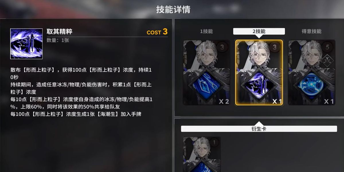3、二技能取其精華散布形而上粒子,獲得持續(xù)數(shù)秒的粒子濃度,期間冰凍物理負(fù)能傷害提高且有上限,部分效果共享隊(duì)友,積累大量濃度生成潮海生加入手牌。