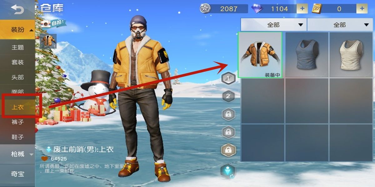 1、進(jìn)入個(gè)人倉(cāng)庫(kù),選擇裝扮欄的上衣選項(xiàng),點(diǎn)擊當(dāng)前裝備的外套即可直接去除,若想更換,點(diǎn)擊想要的外套就能完成裝備,操作便捷直觀。