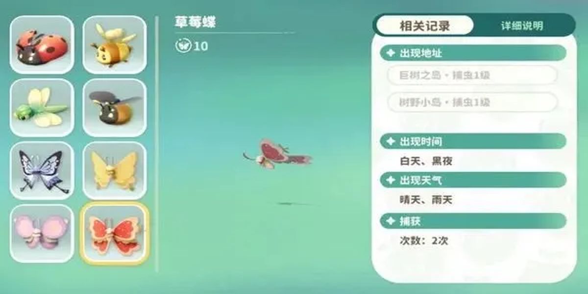 2、草莓碟以粉色翅膀和草莓切片圖案為特點(diǎn),主要分布在巨樹之島和樹野小島的花叢附近,葡萄蝶紫色翅膀帶葡萄串紋理,飛行軌跡呈波浪形,也棲息于這兩個(gè)島嶼。