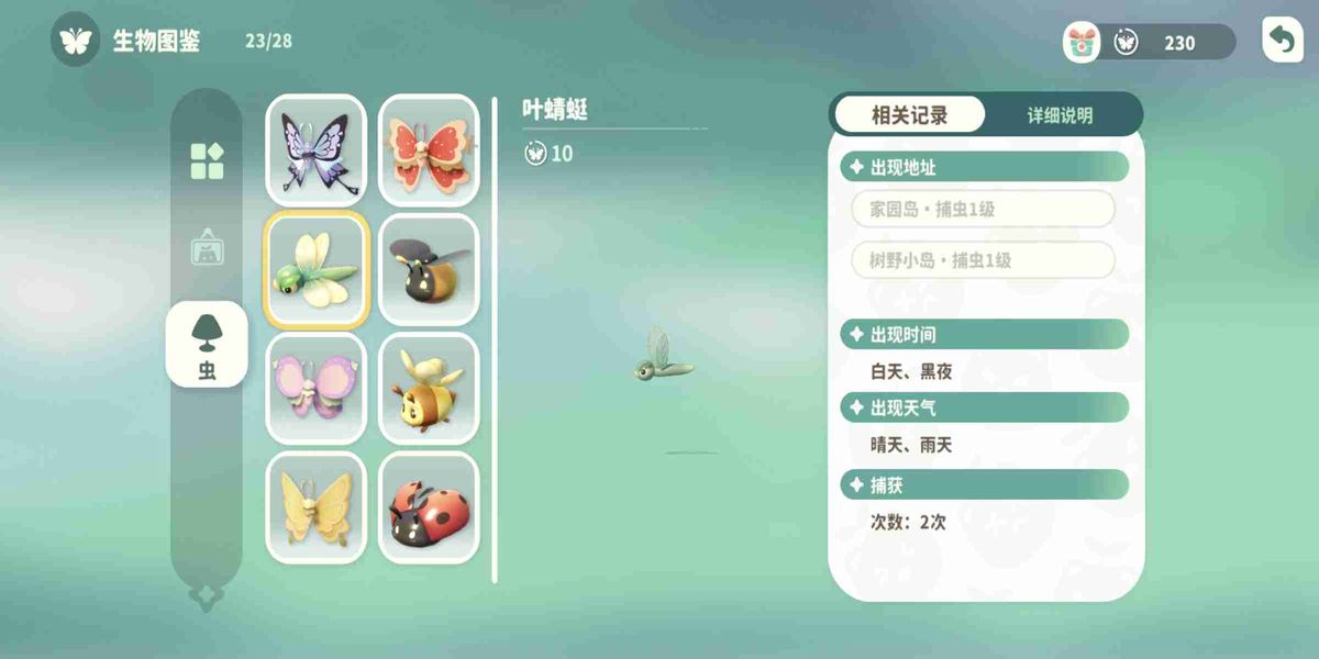 5、玩家需達(dá)到13級(jí)解鎖昆蟲捕捉功能,獲得昆蟲屏后可開始收集,家園島和樹野小島昆蟲種類豐富、捕捉難度低,是新手積累圖鑒的理想地點(diǎn)。