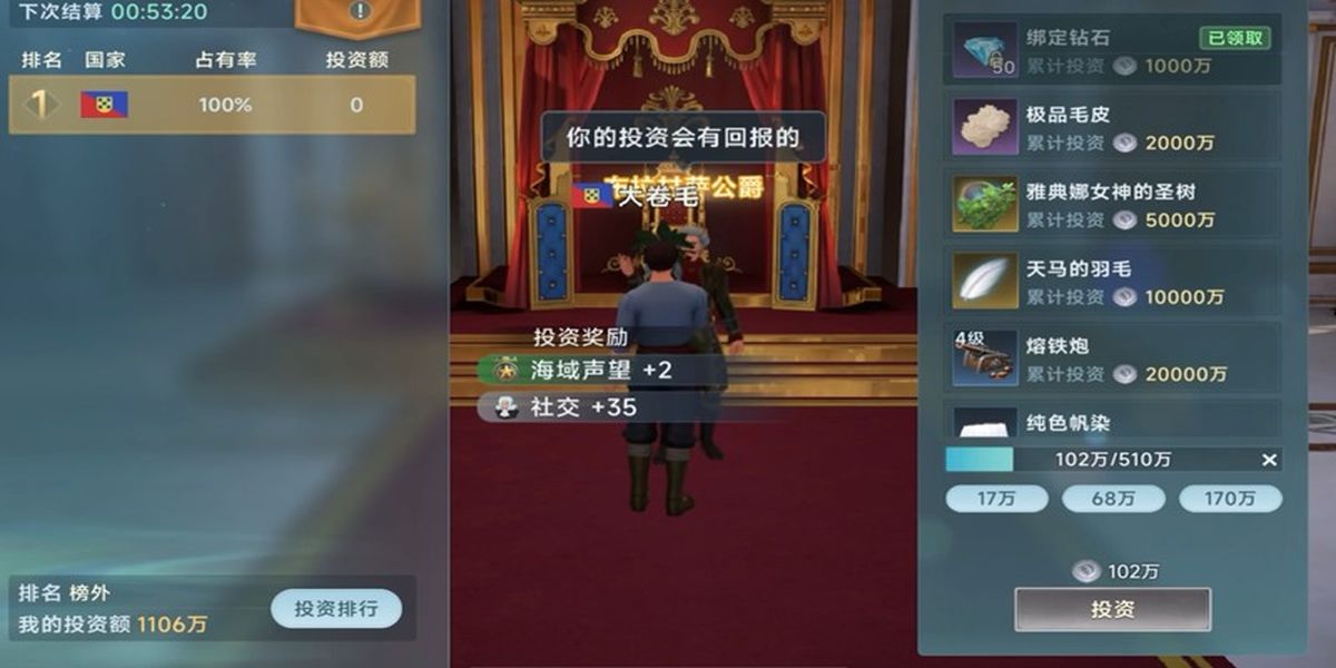 2、月卡每天有穩(wěn)定體力補(bǔ)給,投資體力港口性價比降低,考慮投資橙色吧女禮物,2000萬海幣投資能獲大額金幣回報,利用月卡贈送的體力進(jìn)行海島登陸作戰(zhàn),獲取額外經(jīng)驗書資源。
