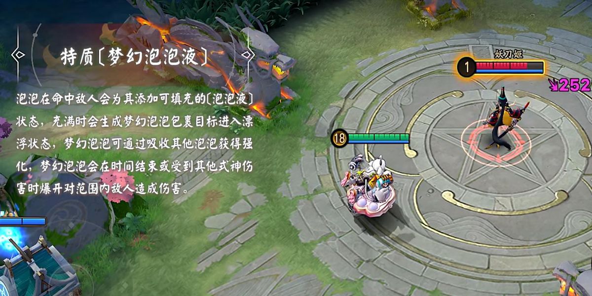 1、特質(zhì)夢(mèng)幻泡泡液,泡泡命中敵人會(huì)添加可填充的泡泡液狀態(tài),充滿時(shí)生成夢(mèng)幻泡泡包裹目標(biāo)進(jìn)入漂浮狀態(tài),夢(mèng)幻泡泡可吸收其他泡泡強(qiáng)化,時(shí)間結(jié)束或受傷害時(shí)爆開對(duì)敵人造成傷害。