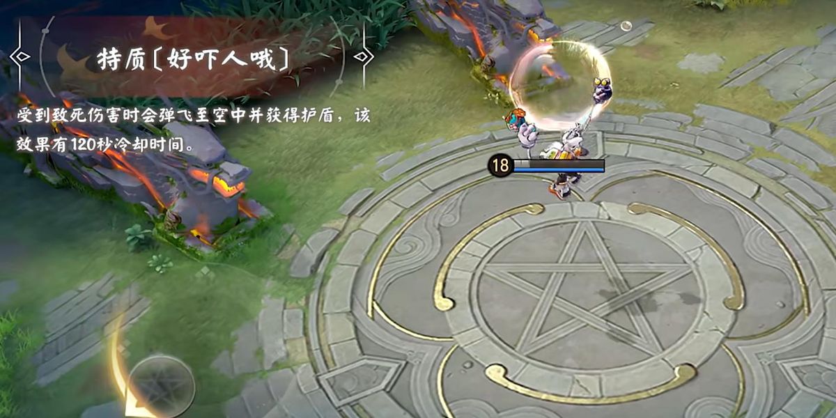3、特質(zhì)好嚇人哦,受到致死傷害時(shí)會(huì)彈飛至空中并獲得護(hù)盾,該效果有120秒冷卻時(shí)間,為蘭蘭提供了一定的生存保障。