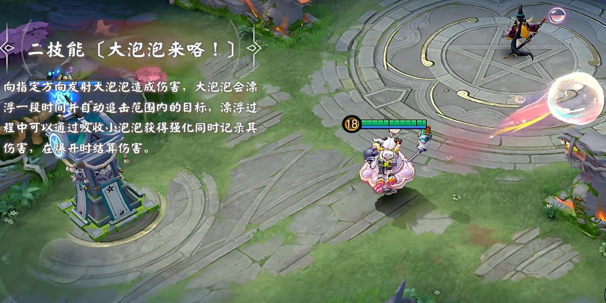5、二技能大泡泡來咯,向指定方向發(fā)射大泡泡造成傷害,大泡泡會(huì)漂浮一段時(shí)間并自動(dòng)追擊范圍內(nèi)目標(biāo),漂浮過程中可吸收小泡泡強(qiáng)化并記錄傷害,爆開時(shí)結(jié)算傷害。