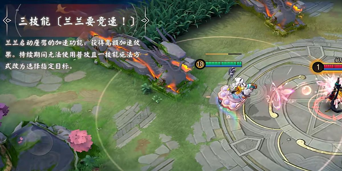 6、三技能蘭蘭要競(jìng)速,蘭蘭啟動(dòng)座駕加速功能,獲得高額加速效果,持續(xù)期間無法使用普攻且一技能施法方式改為選擇指定目標(biāo),可用于調(diào)整自身位置或追擊敵人。