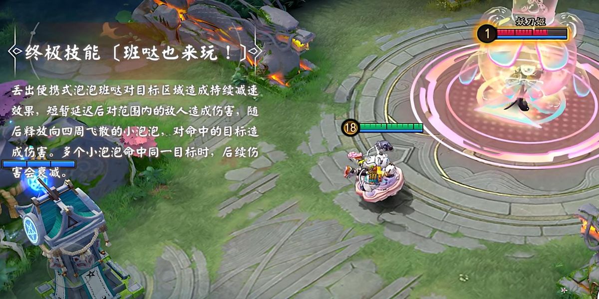 7、終極技能班噠也來玩,丟出泡泡班噠對(duì)目標(biāo)區(qū)域造成持續(xù)減速效果,延遲后對(duì)范圍內(nèi)敵人造成傷害,隨后釋放飛散的小泡泡,對(duì)命中目標(biāo)造成傷害,泡泡命中同一目標(biāo)時(shí)傷害衰減。