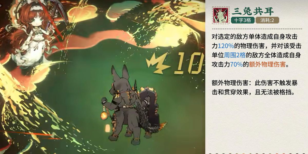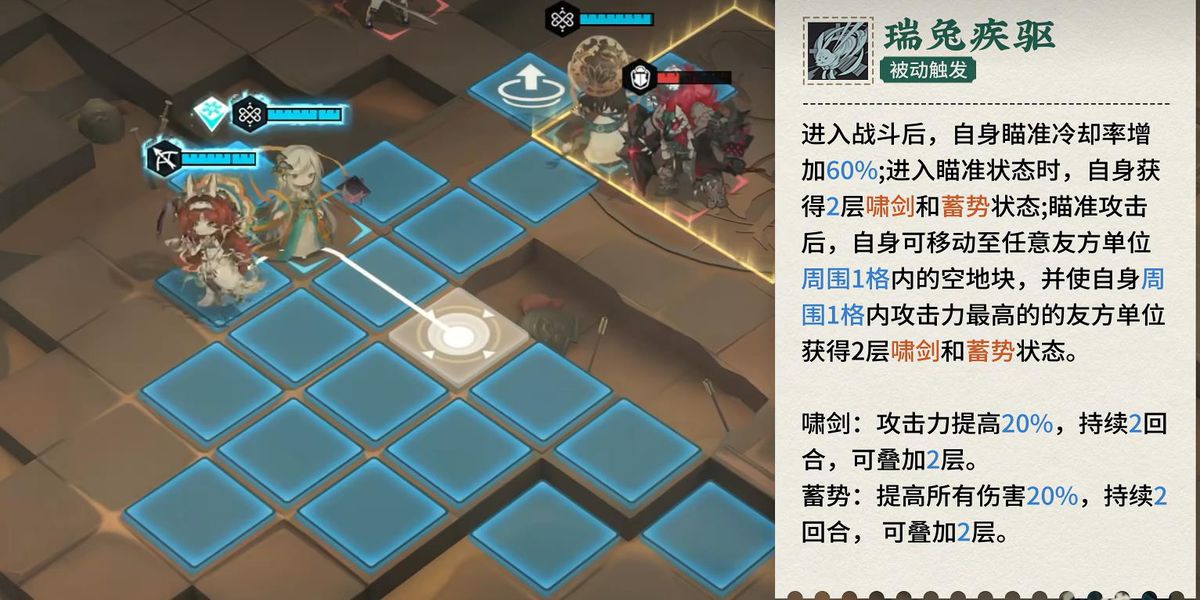 3、被動(dòng)技能瑞兔疾驅(qū)強(qiáng)力,進(jìn)入戰(zhàn)斗后自身瞄準(zhǔn)冷卻率增加60%,進(jìn)入瞄準(zhǔn)狀態(tài)時(shí)自身獲2層嘯劍和蓄勢(shì)狀態(tài),還能讓自身周圍1格內(nèi)攻擊力最高的友方單位獲2層嘯劍和蓄勢(shì)狀態(tài)。