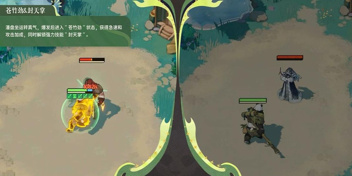 1、必殺技竹破蒼穹讓潘盤坐竹竿運轉(zhuǎn)真氣,對范圍內(nèi)敵人造成傷害并進(jìn)入蒼竹勁狀態(tài),該狀態(tài)下每秒消耗能量但獲攻擊力和急速加成,同時有霸體效果,兼顧傷害與輸出環(huán)境。