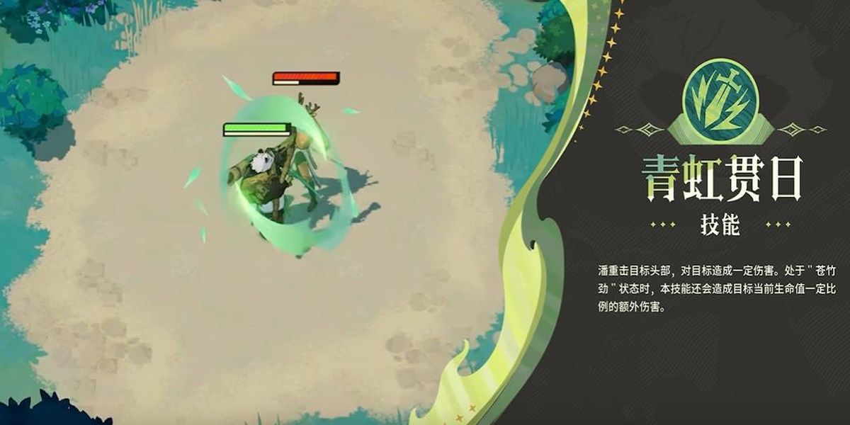 3、青虹貫日在蒼竹勁狀態(tài)下,重?fù)魰鶕?jù)目標(biāo)當(dāng)前生命值造成額外傷害并獲護(hù)盾,護(hù)盾破碎時轉(zhuǎn)化為飛葉造成二次傷害,賦予潘出色的生存和收割能力。