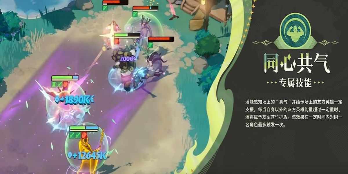 4、專屬技能同心共氣讓潘能感知隊友真氣狀態(tài),當(dāng)隊友能量達(dá)一定量時隨機提供護(hù)盾,這個輔助效果可為團隊提供額外保護(hù),增強整體續(xù)航能力。