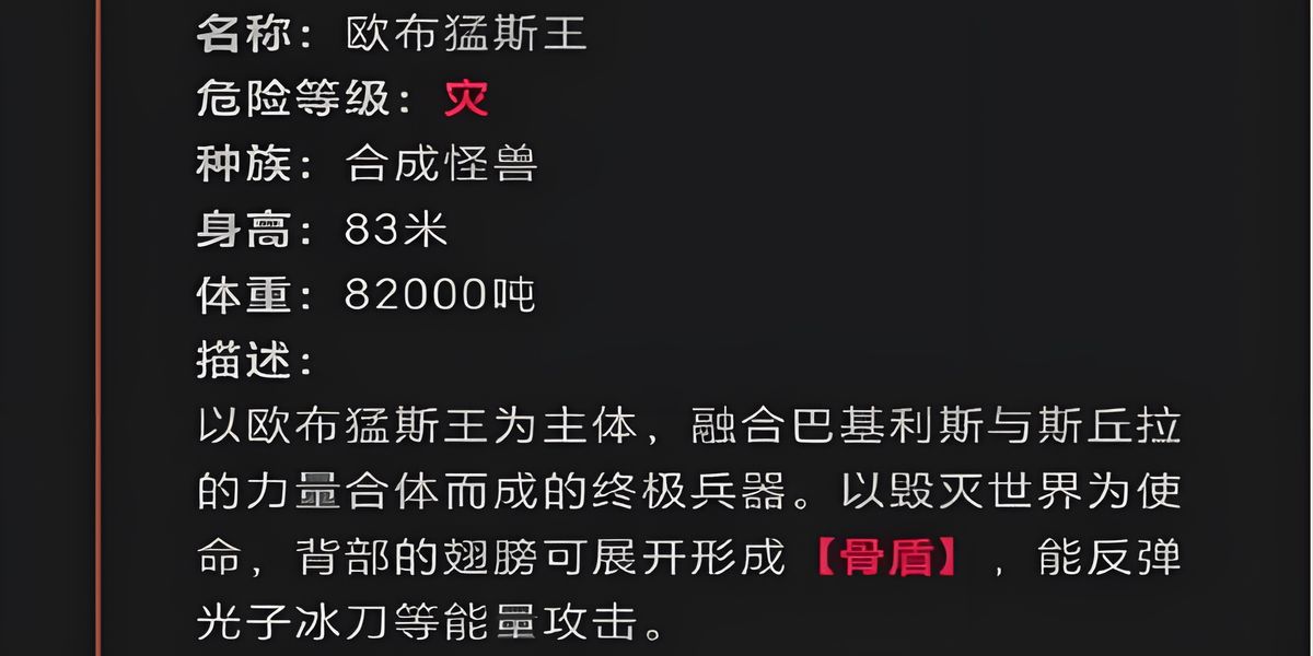 1、以歐布猛斯王為主體,融合巴基利斯與斯丘拉力量,身高83米,體重82000噸,背部翅膀可展開(kāi)成骨盾,反彈光子冰刀等能量攻擊,防御時(shí)骨翼結(jié)晶化增強(qiáng)防御。