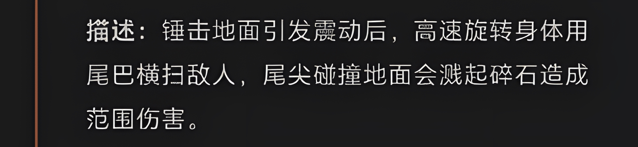 3、猛斯尾巴攻擊先錘擊地面再高速旋轉(zhuǎn)橫掃,尾尖撞地濺起碎石造成范圍傷害,振翅蹴?yè)粽駝?dòng)翅膀升空俯沖踩擊,落地沖擊波擊退周?chē)繕?biāo)。