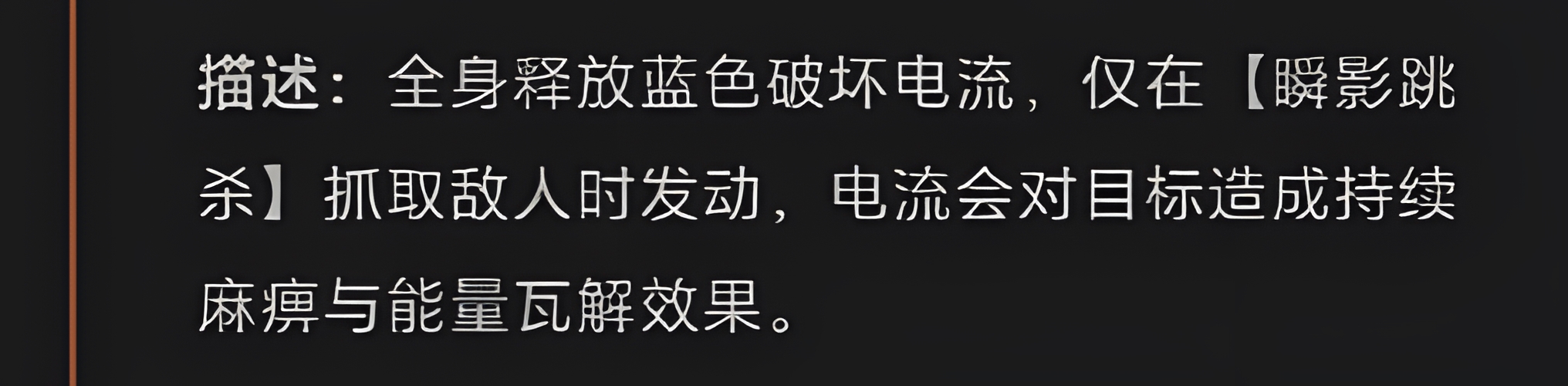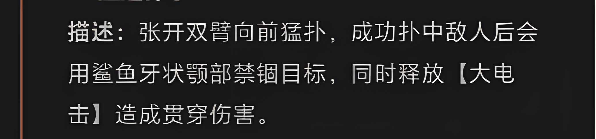 4、猛進(jìn)撲殺張開(kāi)雙臂猛撲,用鯊魚(yú)牙狀顎部禁錮敵人并釋放大電擊造成貫穿傷害,瞬影跳殺跳躍至半空消失后瞬移砸擊,抓取成功觸發(fā)大電擊使敵人癱瘓。