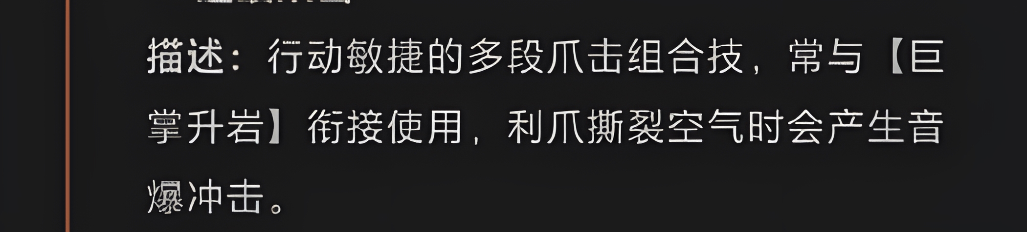 2、連續(xù)爪擊為敏捷多段爪擊,常銜接巨掌升巖,利爪撕裂空氣產(chǎn)生音爆沖擊,巨掌升巖掀起巖層作掩體或配合攻擊,讓敵人難以應(yīng)對(duì)。