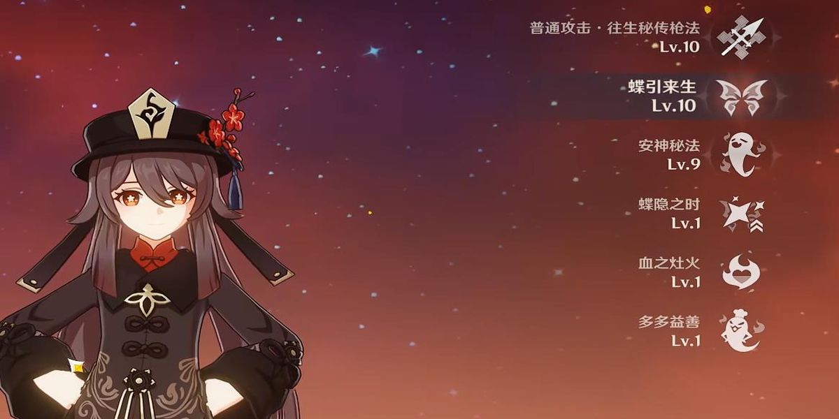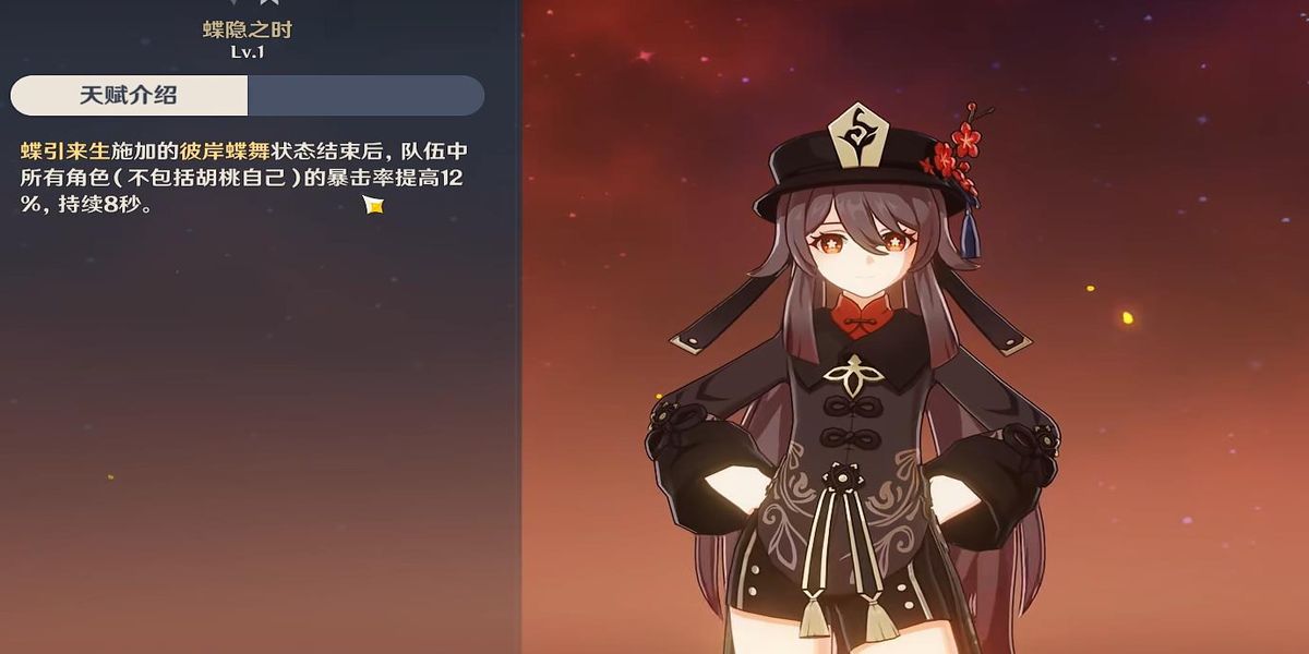 4、蝶隱之時(shí),胡桃受傷害后有一定概率在接下來(lái)10秒內(nèi),使隊(duì)伍中所有角色不包括胡桃自己火元素傷害提高,為團(tuán)隊(duì)火元素輸出提供增益。