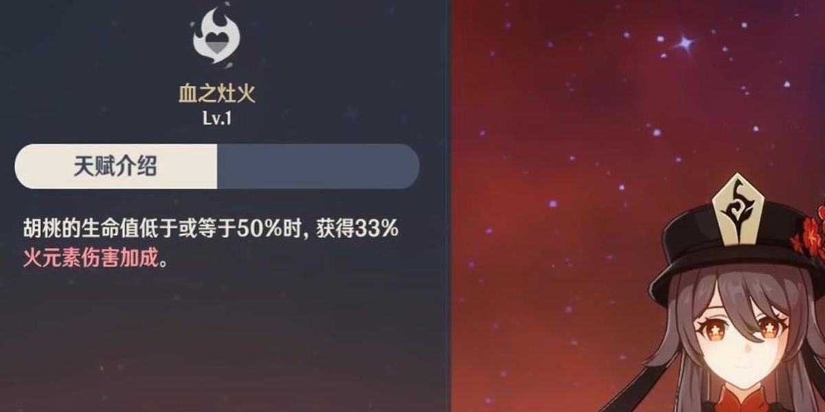 6、多多益善,隊(duì)伍中所有角色不包括胡桃自己在生命值上限低于50%時(shí)暴擊率提升,讓胡桃在隊(duì)伍搭配時(shí)可與一些低血量爆發(fā)角色形成配合。