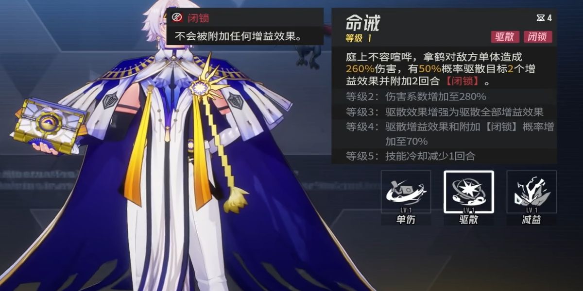 2、二技能命誡,驅(qū)散敵方單體兩個增益buff,造成260%傷害,50%概率附加2回合閉鎖,等級3變?yōu)轵?qū)散全部增益,等級4提高概率至70%,等級5減少冷卻,建議優(yōu)先升滿。