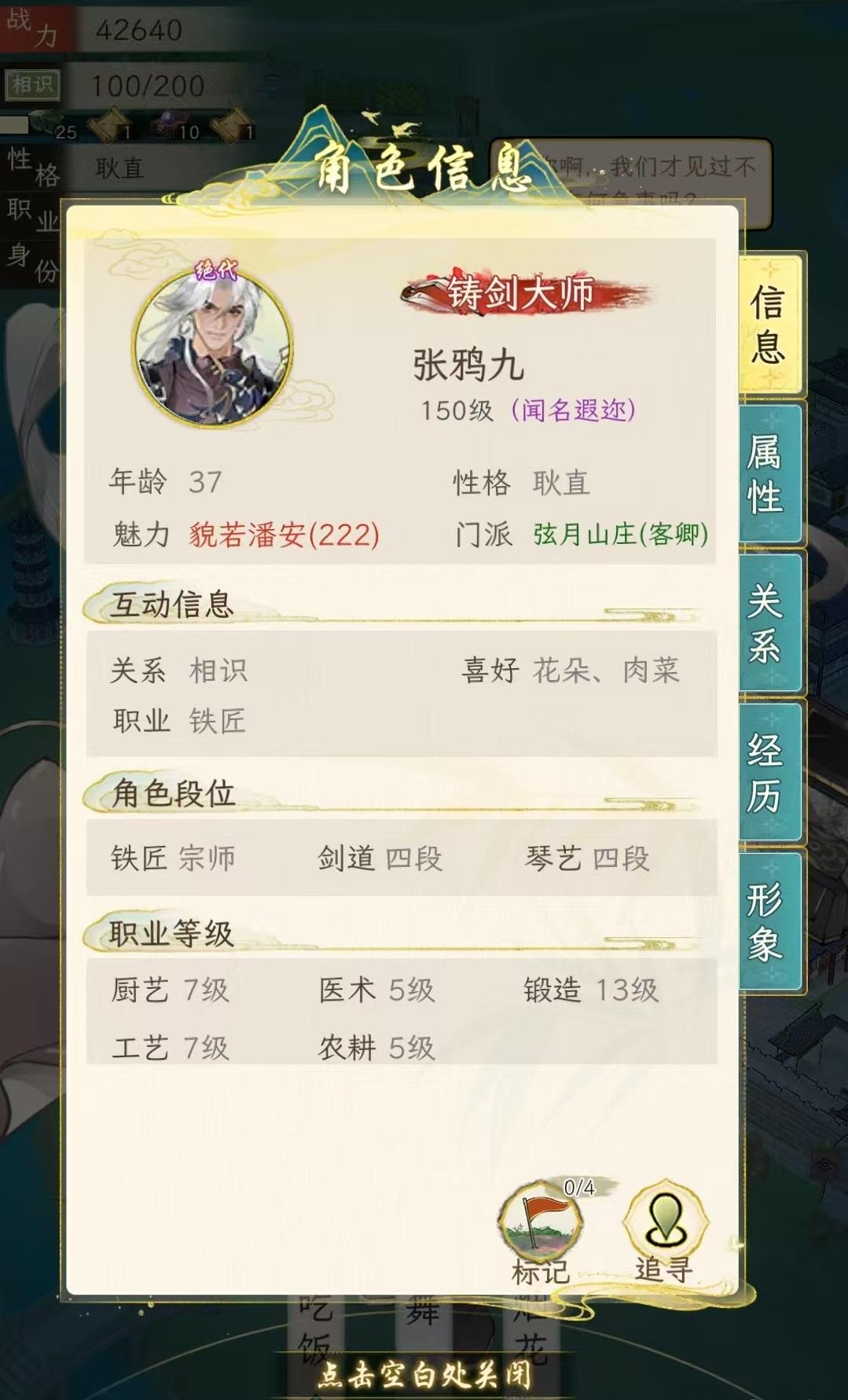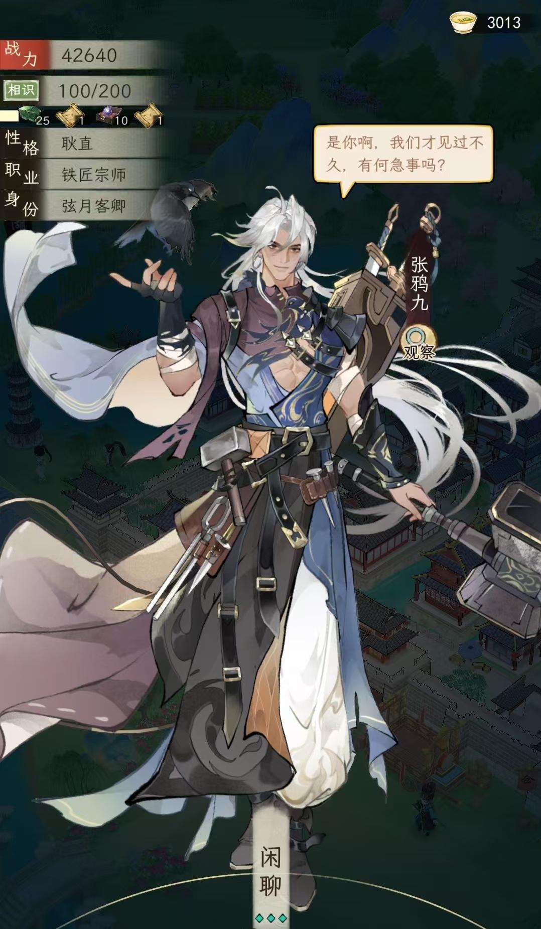 1、張鴉九稱號為鑄劍大師,跟隨主線即可結(jié)識,可通過閑聊吃飯?zhí)杩礋熁ㄋ投Y等互動提升關(guān)系,結(jié)緣后能拜其為師結(jié)義或拜義父,性格耿直職業(yè)是鐵匠宗師身份為弦月客卿。