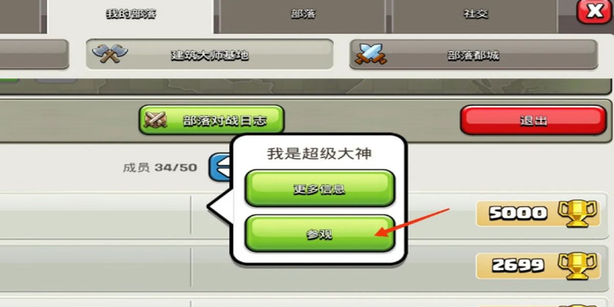 2、借助玩家部落復(fù)制,打開部落沖突,在主界面點擊部落建筑進(jìn)入我的部落,選想復(fù)制陣型的玩家,點擊參觀,進(jìn)入對方基地后,點擊陣型。