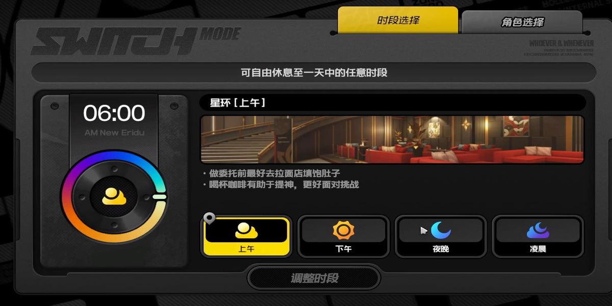 2、到達(dá)流光大廳后,需將游戲內(nèi)時間調(diào)整至工作時段,09點(diǎn)到18點(diǎn),可通過游戲內(nèi)時間設(shè)置功能完成調(diào)整,該時段才會出現(xiàn)觸發(fā)成就的必要角色互動。