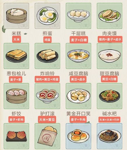 2、部分菜品有特定食材搭配,肉夾饃需豬肉麥子鹵水,蔥包檜兒需麥子蔥,蝦餃需麥子蝦肉,蛋炒飯需大米雞蛋,食材搭配貼近現(xiàn)實(shí)烹飪實(shí)際需求。