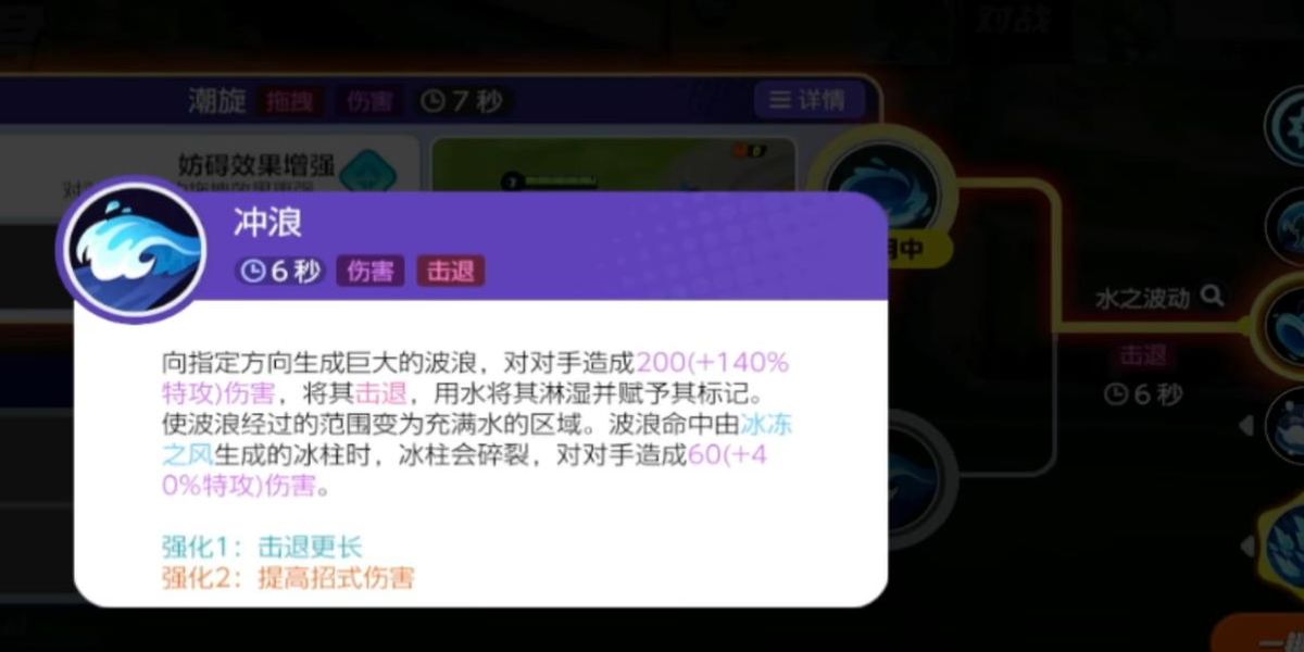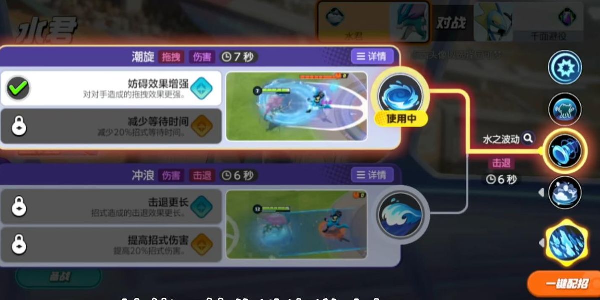 4、招式2潮旋往指定地點(diǎn)卷起水流旋渦,持續(xù)傷害并拖拽對(duì)手至中心,淋濕對(duì)手并標(biāo)記,再次使用可使旋渦向指定方向移動(dòng),讓經(jīng)過(guò)范圍充滿(mǎn)水流,增強(qiáng)控制效果。