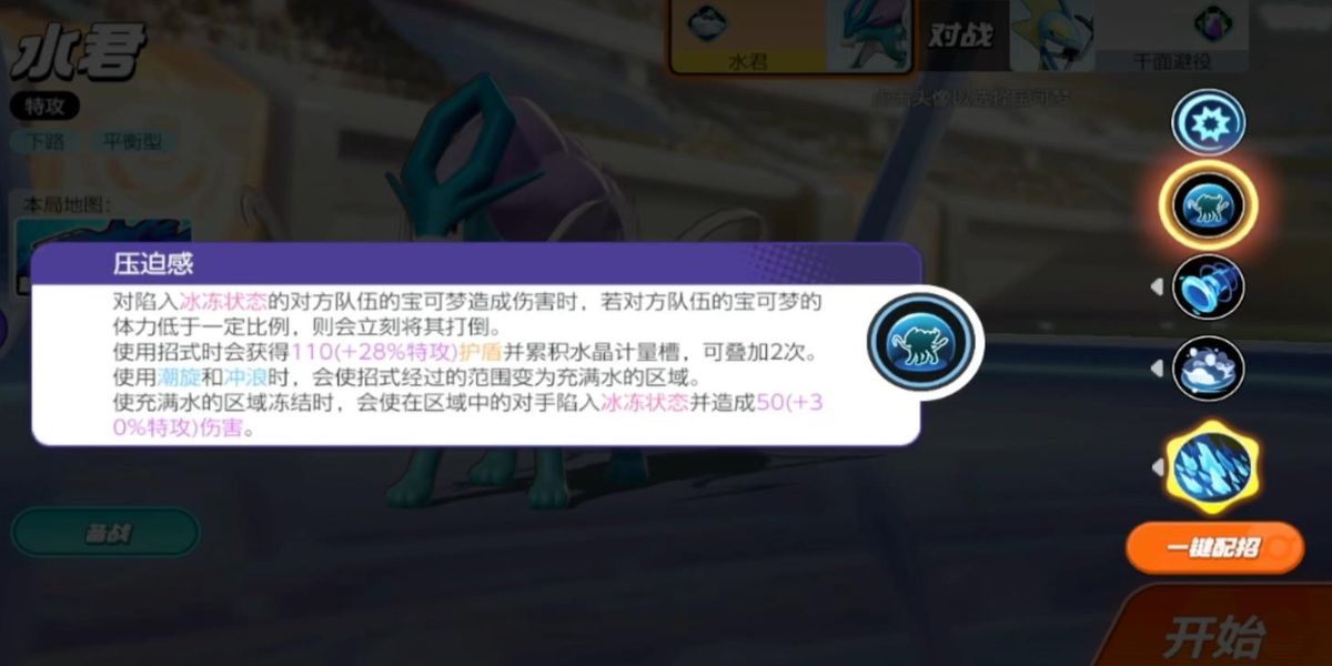 1、普通攻擊有強(qiáng)化機(jī)制,水晶計(jì)量槽全滿(mǎn)時(shí),下一次普攻變?yōu)閺?qiáng)化普攻,持續(xù)噴射水流造成多次傷害,對(duì)冰凍狀態(tài)的敵方寶可夢(mèng)額外造成傷害,提升輸出效率。